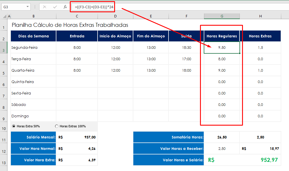 Planilha cálculo de hora extra semanal: Para isso, vamos utilizar a seguinte fórmula. La plantilla de excel para el cálculo de horas extras semanales permite hacer un registro de las horas extras y calcula el monto total a pagar por ellas.
